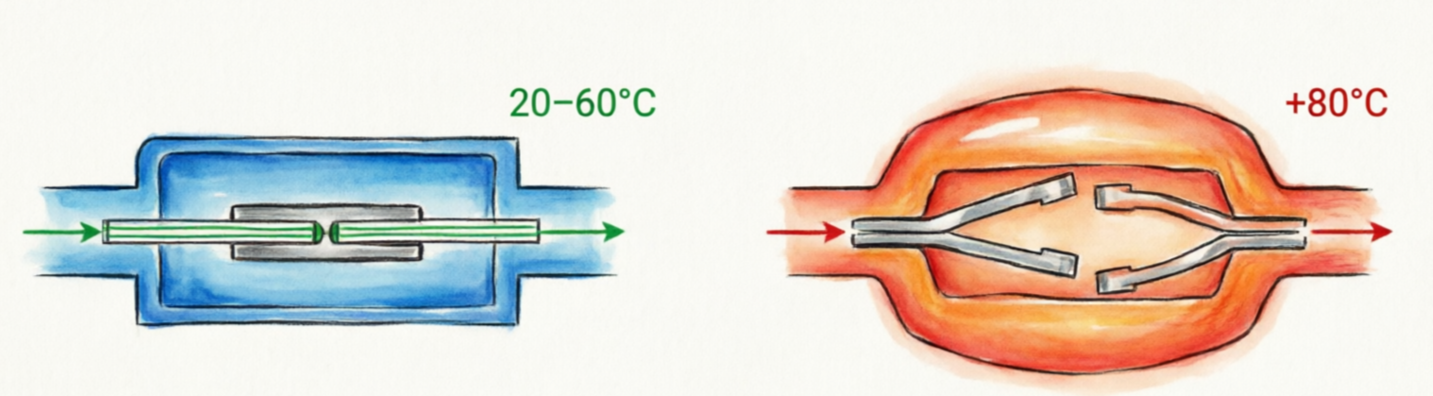 Корпус деформируется при +80°C → механическое отключение. Безопасность без электроники и датчиков. Работает даже при их отказе.