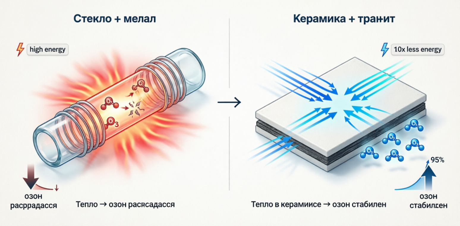 Керамическая пластина с графитовым проводником вместо стекла и металла. Тепло уходит в керамику — озон не распадается. Потребление энергии в 10 раз ниже.