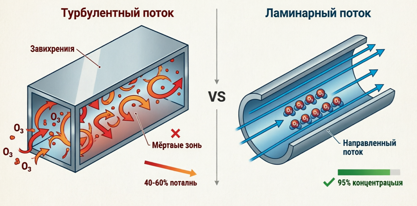 Трубчатая конструкция корпуса без углов. Направленный поток сохраняет 95% концентрации на выходе. Нет турбулентности, нет потерь.