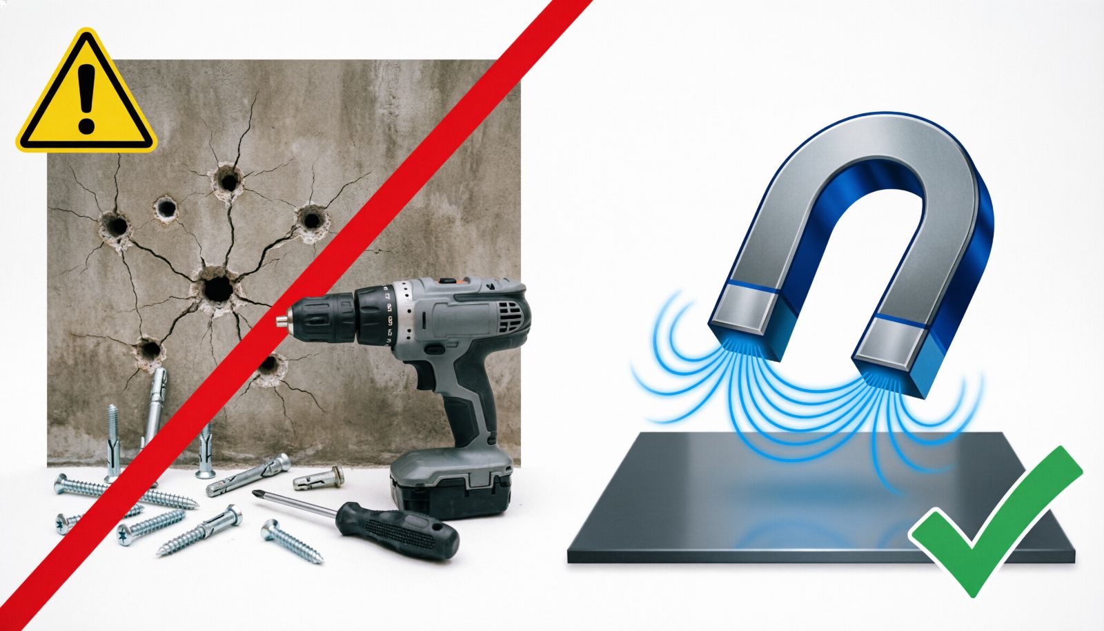 Никаких отверстий, крепежа, повреждения поверхностей. Идеально для арендованных помещений и временного использования.